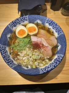 あご出汁と醤油の絶妙なバランス、麺は北海道産の麺を使っており、もっちりとした食感が特徴です!味変の黒胡椒と柚胡椒は必須です!