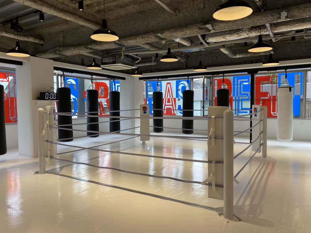 キックボクシングジム リフィナスは一流デザイナー設計による白を基調とした内装でスポーツのイメージとはかけ離れたモダンで高級感溢れる空間です。リフィナスのロゴカラーである青と赤がアクセントとなっていて空間に統一感を与えています。